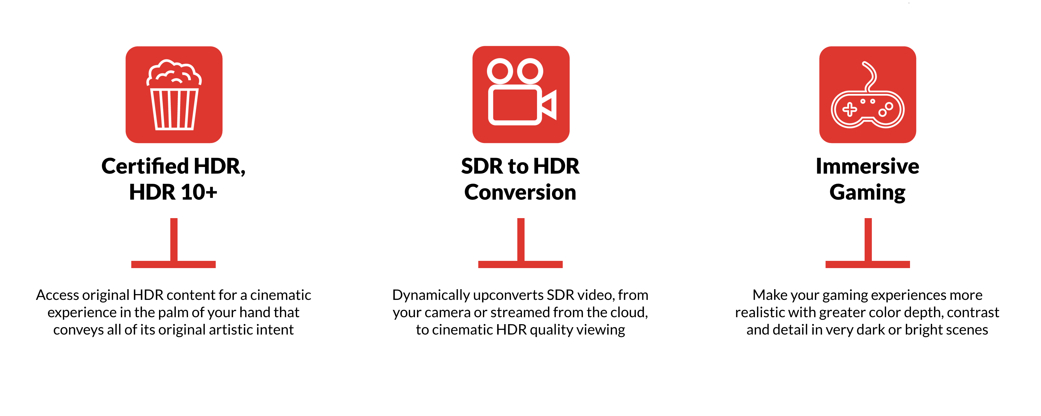 High Dynamic Range (HDR) technology gives movies, games and camera content immersive color depth and contrast. Pixelworks visual processors provide precision tone mapping for HDR 10 and HDR 10+ content across smartphone product tiers. For the vast majority of movies, games and user videos that still exist in Standard Dynamic Range (SDR) format, Pixelworks processors dynamically up-map this content from SDR to HDR for the ultimate, Always-on HDR visual experience.
