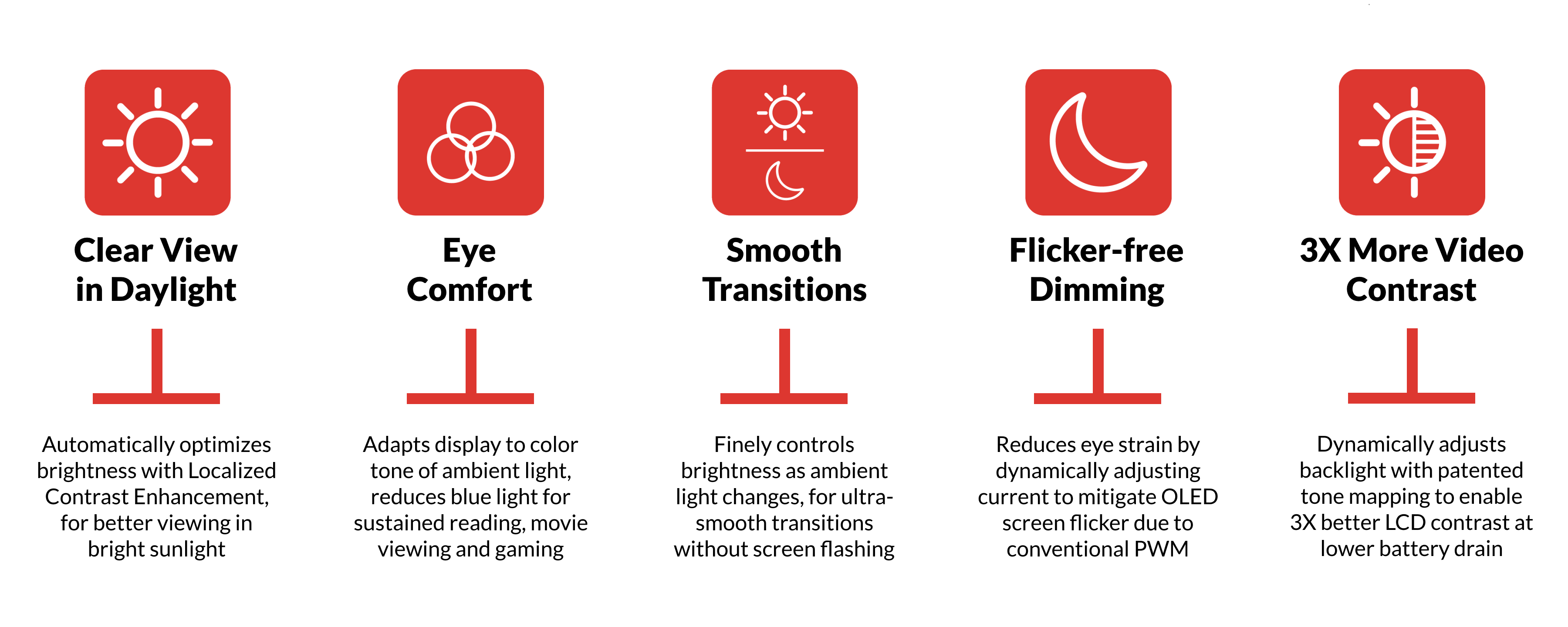 Mobile devices are used everywhere, from dark rooms to the sunny outdoors. Pixelworks’ auto adaptive technology dynamically adjusts the smartphone’s display in response to changes in ambient brightness, color temperature and content characteristics in order to preserve visual clarity and eye comfort in all viewing conditions.